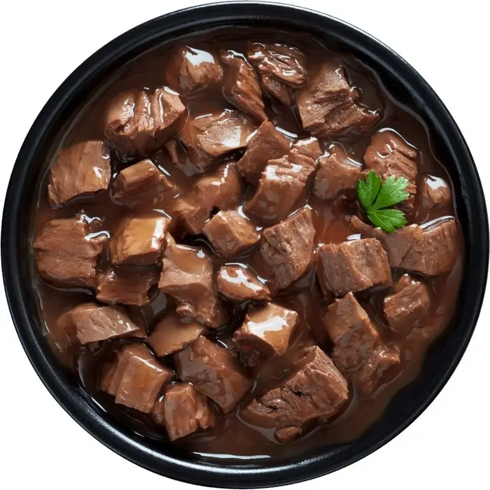 Мясо и субпродукты (в том числе говядина), продукты растительного происхождения, загустители, минеральные вещества, аминокислоты (в том числе таурин), витамины, сахара, натуральные красители.