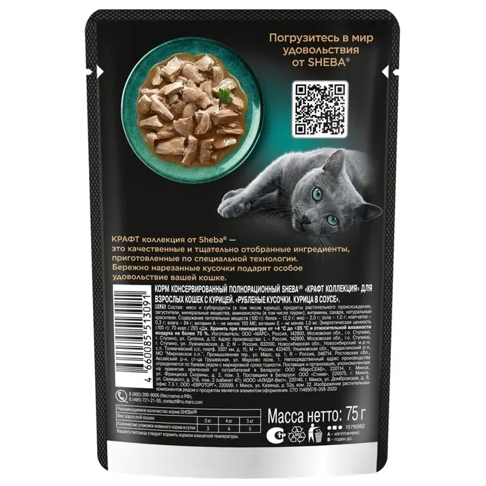 Влажный корм Sheba Craft для кошек, курица, соус, пауч, 75 г