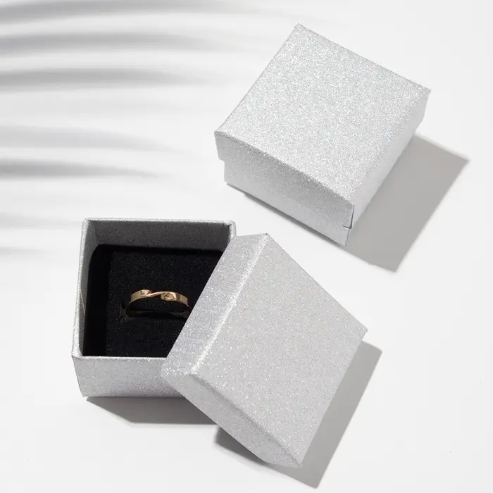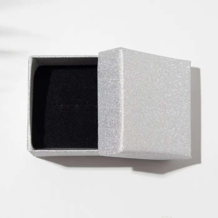 Серебристый цвет коробочки с глиттером добавляет блеска и элегантности, делая её идеальным выбором для любых торжеств. Квадратная форма и чёрная вставка внутри обеспечивают надёжное размещение украшений, а также создают контраст, который привлекает внимание. Без банта, но с изысканным дизайном, эта коробочка станет прекрасным дополнением к любому подарку.