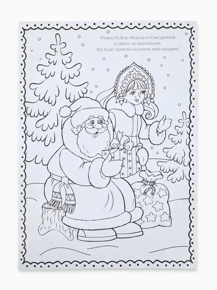 2. Затем на обратной стороне письма малыш может раскрасить новогоднюю картинку и декорировать её вырезными наклейками из набора — так будет волшебнее!