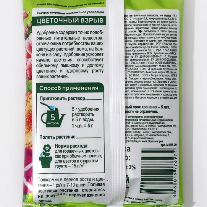 Водорастворимое удобрение "Цветочный взрыв", БиоМастер, создано для активно растущих и цветущих растений: петуния, герань, бегония, эустома, герберы, фуксия.