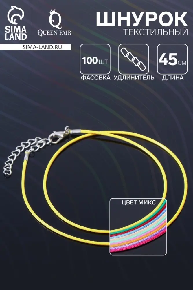 Шнурок текстильный, фасовка 100 шт., длина 45 см с удлинителем 5 см, цвет МИКС – это универсальный и удобный материал для создания множества украшений и аксессуаров. В комплекте 100 шнурков различных цветов, что позволяет легко комбинировать их с различными декоративными элементами, создавая уникальные и стильные изделия. Удлинитель длиной 5 см добавляет гибкости и позволяет регулировать размер украшений под индивидуальные предпочтения.