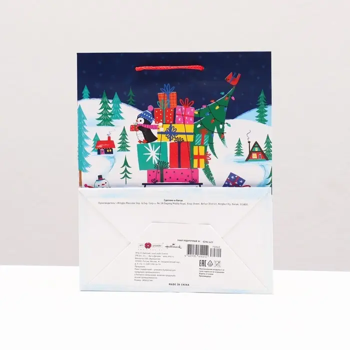Новогодний подарочный пакет с ярким, красочным рисунком создаст праздничное настроение.