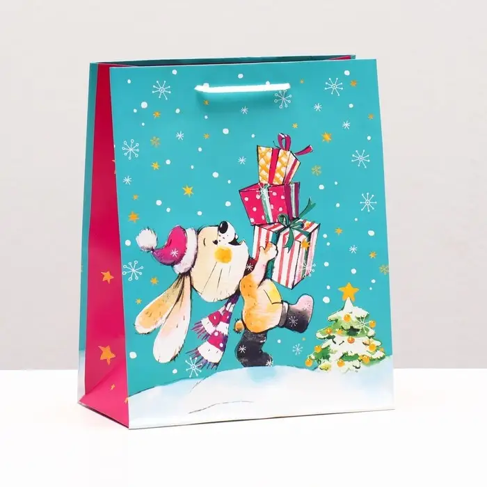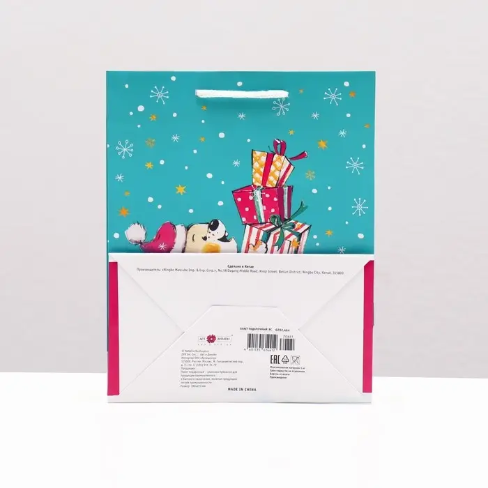 Новогодний подарочный пакет с ярким, красочным рисунком создаст праздничное настроение.