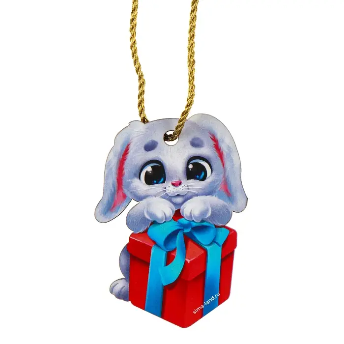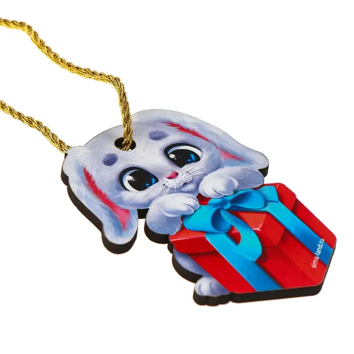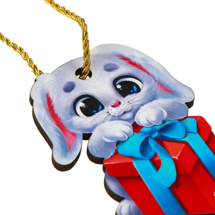 Ёлочная игрушка - подвеска деревянная «Новый год! Зайка с подарком»