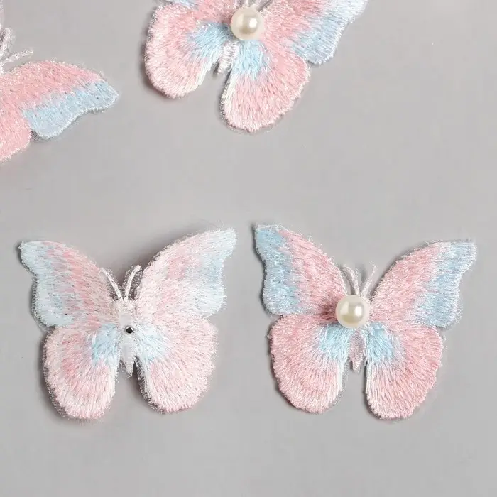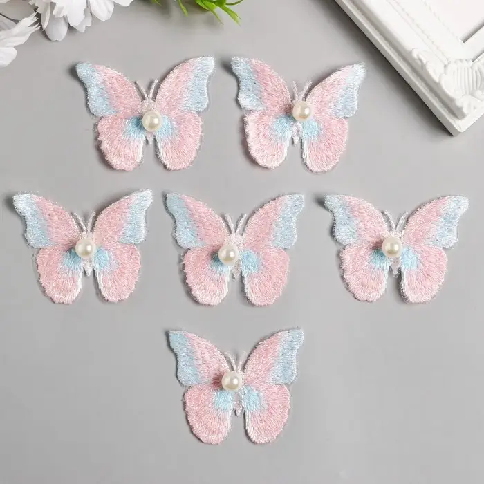 Декор для творчества текстиль вышивка "Бабочка розово-голубая" двойные крылья 5х6,3 см