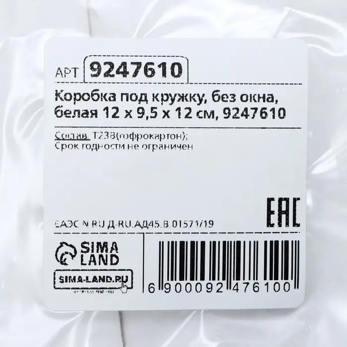 Коробка под кружку, без окна, белая 12×9.5×12 см