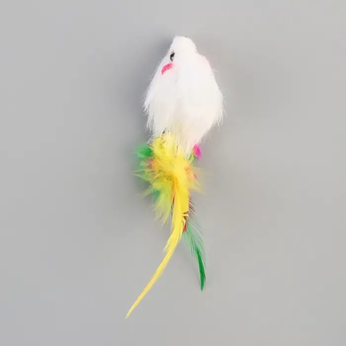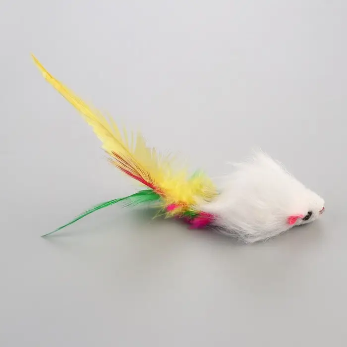 Мышь меховая однотонная с перьями 6,5 см, белая