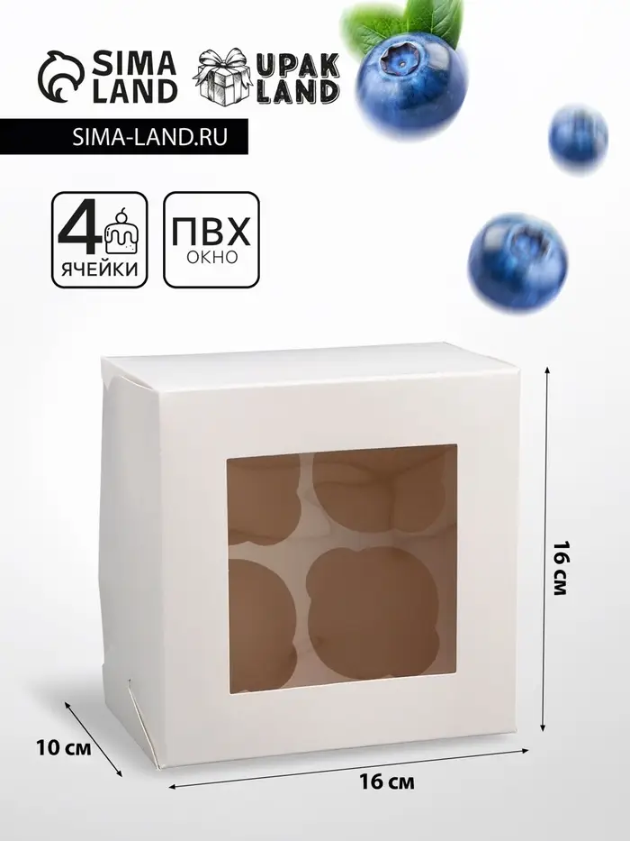 Коробка для 4 капкейка с окном, белая, 16×16×10 см