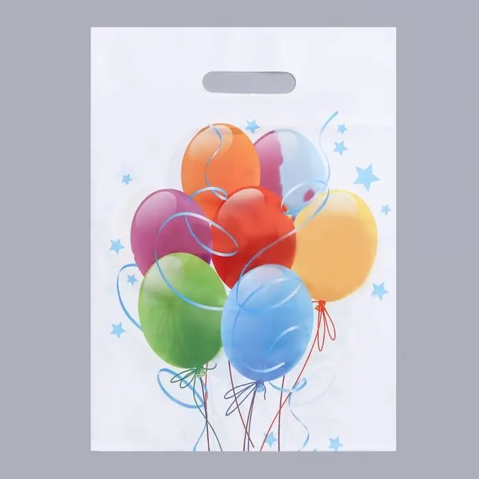 - Яркий праздничный принт: Разноцветные шары на пакете выглядят нарядно и подходят для любого торжества.