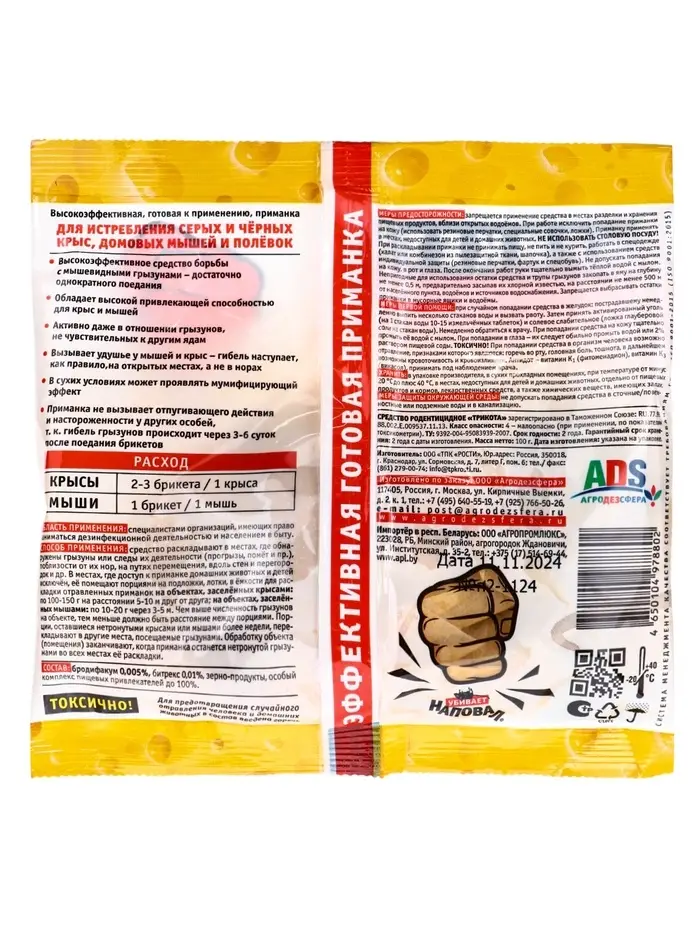 Высокоэффективная готовая к применению приманка для истребления серых и чёрных крыс, домовых мышей и полёвок. Высокоэффективное средство борьбы с мышевидными грызунами - достаточно однократного поедания.