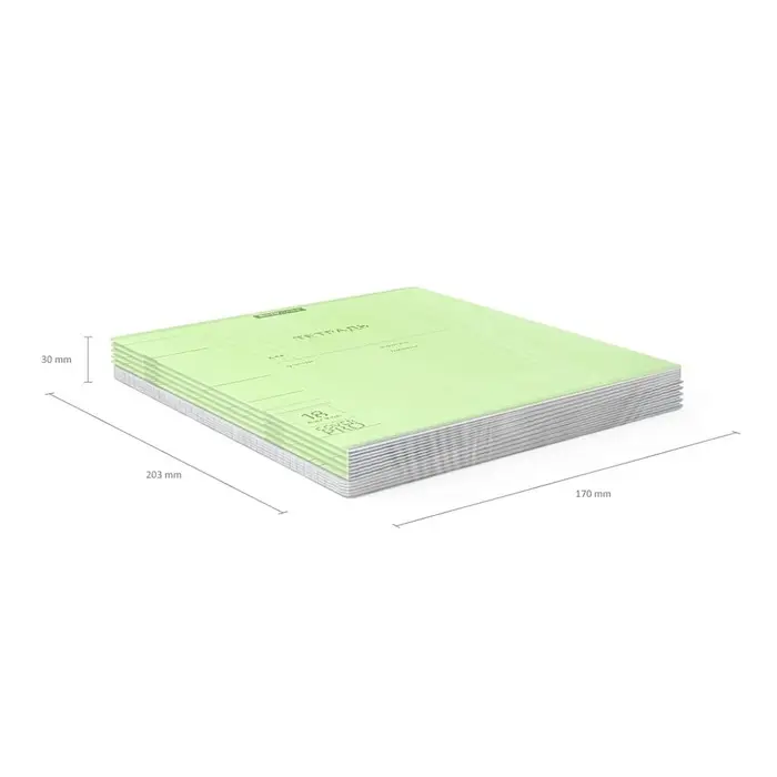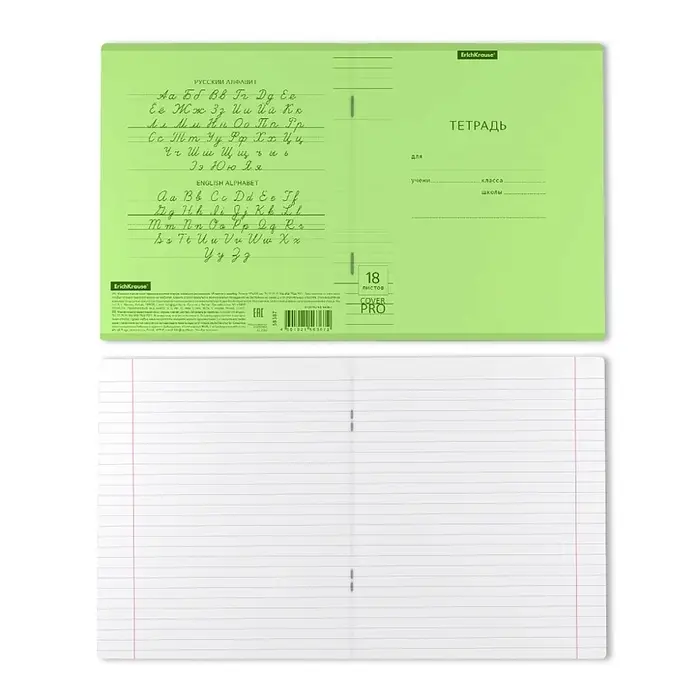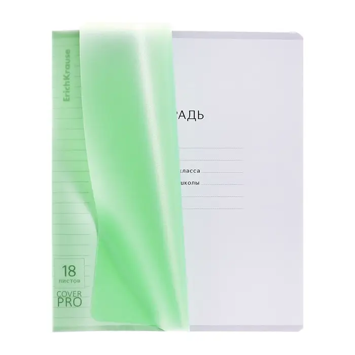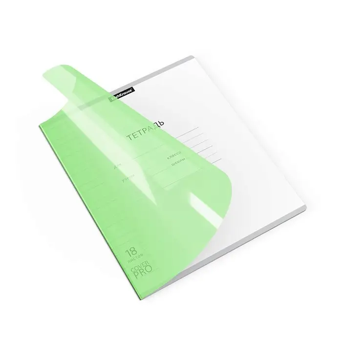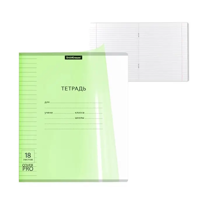 Тетрадь школьная ученическая формата А5+ (170x203 мм). Двойная обложка: внешняя выполнена из высококачественного износостойкого цветного пластика с фактурой «апельсиновая корка», внутренняя — из офсетной бумаги. В блоке 18 листов в линейку. Тетради упакованы в термоусадочную пленку по 10 штук.