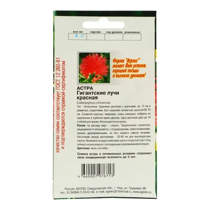 Семена Цветов Астра Гигантские лучи Красная, 0,2 г
