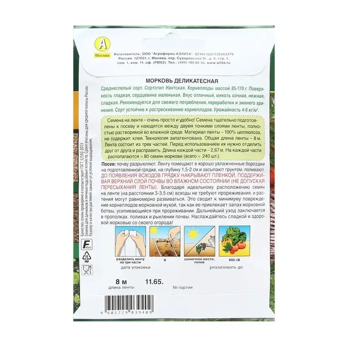 Для выращивания моркови отводят участки с рыхлой плодородной супесчаной, либо суглинистой почвой. Лучшие предшественники - капуста, картофель, огурец. Весной перед посевом в почву комплексное минеральное удобрение.При посадке лента должна лечь во влажную почву на глубину 1,5-2 см. Расстояние между рядами 18-20 см. Желательно разместить ленту «на ребро», так чтобы клеевое соединение оказалось наверху. После появления всходов уход заключается в прополке и регулярном поливе. Всходы не прореживают. Подзимние посевы проводят, когда температура опустится до 5°С (вторая половина октября - начало ноября).