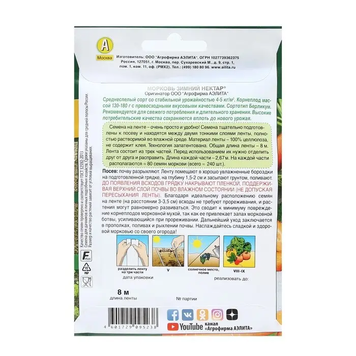 Семена на ленте – очень просто и удобно! Семена тщательно подготовлены к посеву и находятся между двумя тонкими слоями ленты, полностью растворимой во влажной среде. Материал ленты – 100% целлюлоза, не содержит клея. Технология запатентована. Общая длина ленты – 8 м. Лента состоит из трех частей. Перед использованием их нужно отделить друг от друга и расправить. Длина каждой части – 2,67 м. На каждой части располагаются ≈ 80 семян моркови.