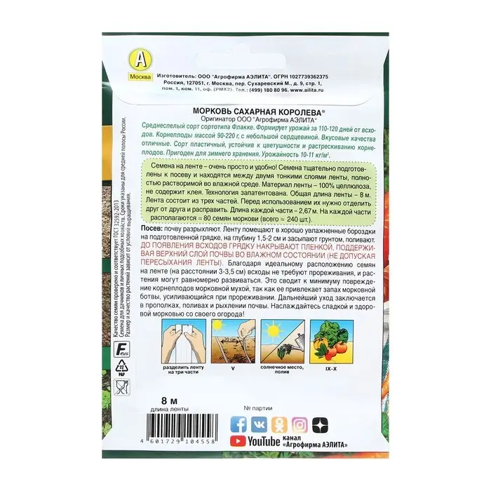 Семена на ленте – очень просто и удобно! Семена тщательно подготовлены к посеву и находятся между двумя тонкими слоями ленты, полностью растворимой во влажной среде. Материал ленты – 100% целлюлоза, не содержит клея. Технология запатентована. Общая длина ленты – 8 м. Лента состоит из трех частей. Перед использованием их нужно отделить друг от друга и расправить. Длина каждой части – 2,67 м. На каждой части располагаются ≈ 80 семян моркови (всего ≈ 240 шт).