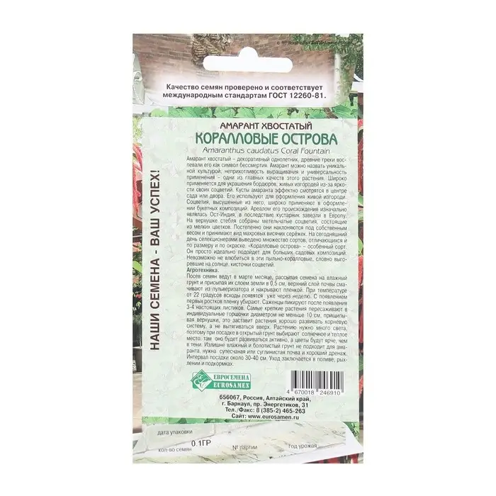 Семена Цветов Амарант хвостатый Коралловые Острова, 0,1 г