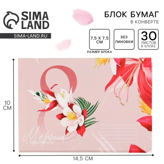 Блок бумаги 30 листов в конверте «8 марта»