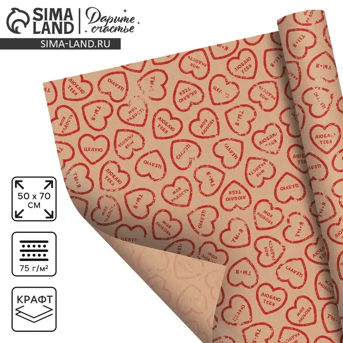 Бумага упаковочная крафтовая «Сердечки», 50х70 см
