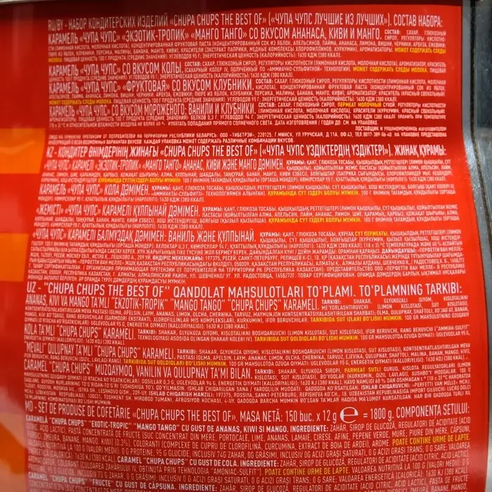 Состав: сахар, глюкозный сироп, пермеат молочный сухой, регуляторы кислотности (лимонная кислота, молочная кислота), красители (куркумин, красный свекольный), ароматизаторы.