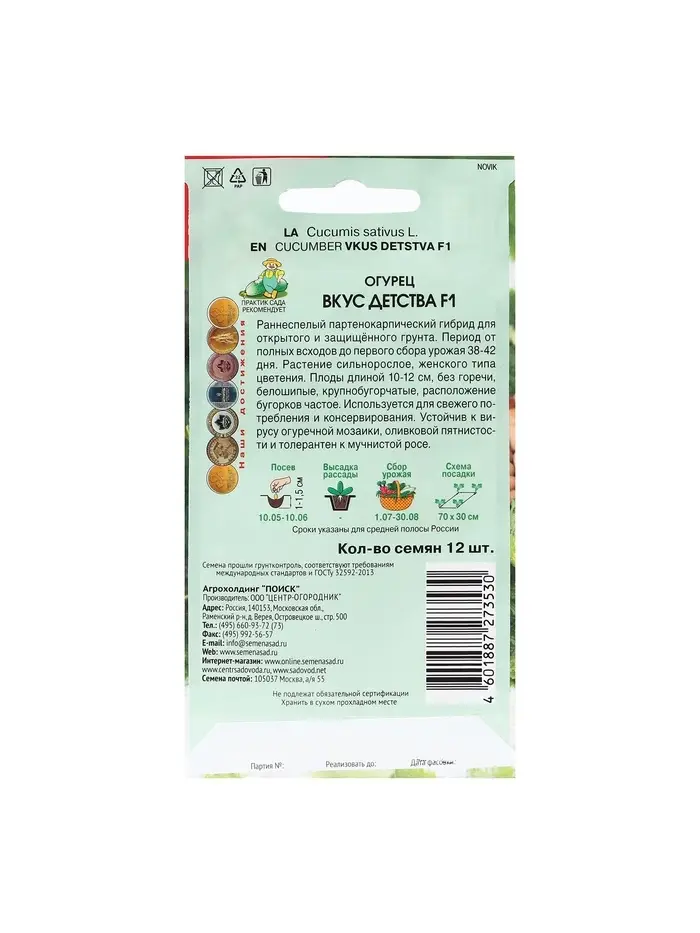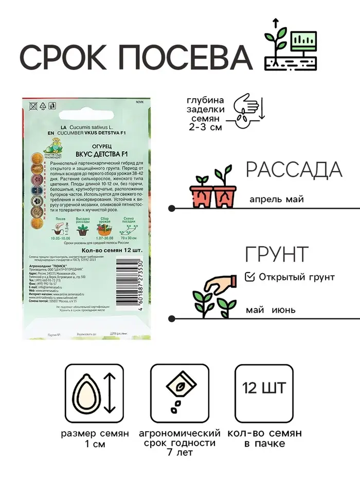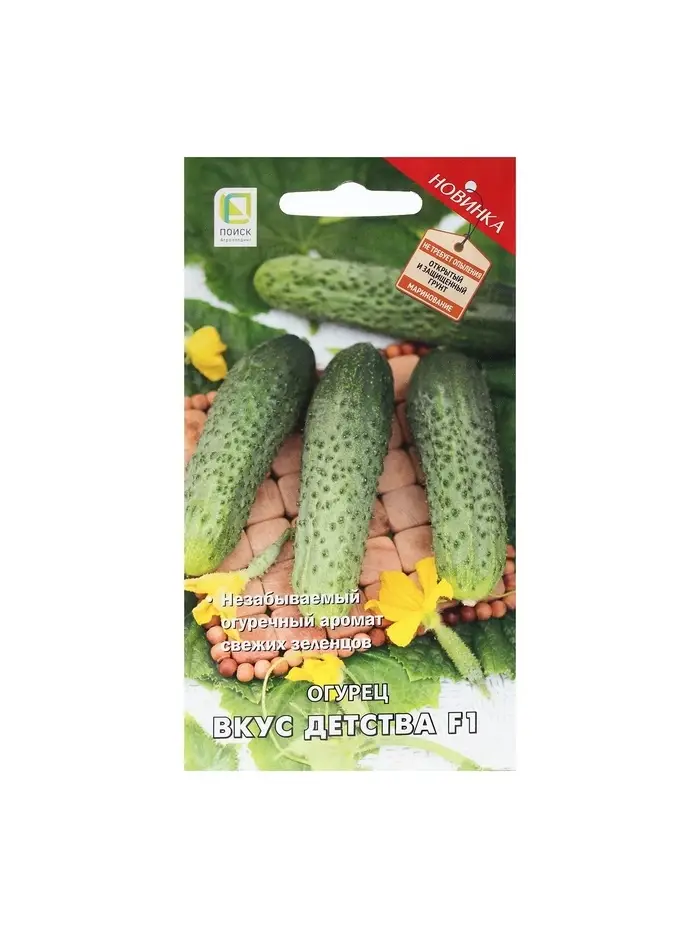 Вкус детства F1 от фирмы «Поиск» – сильнорослый гибрид, на мощных кустах которого развиваются в основном женские цветки. Им не требуется опыление насекомыми, они завязывают плоды самостоятельно, потому с одинаковым успехом плодоносят в теплице и открытом грунте. Плоды созревают через 38-42 дня после прорастания посевов.