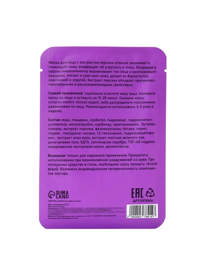 Маска тканевая увлажняющая для лица с экстрактом персика
