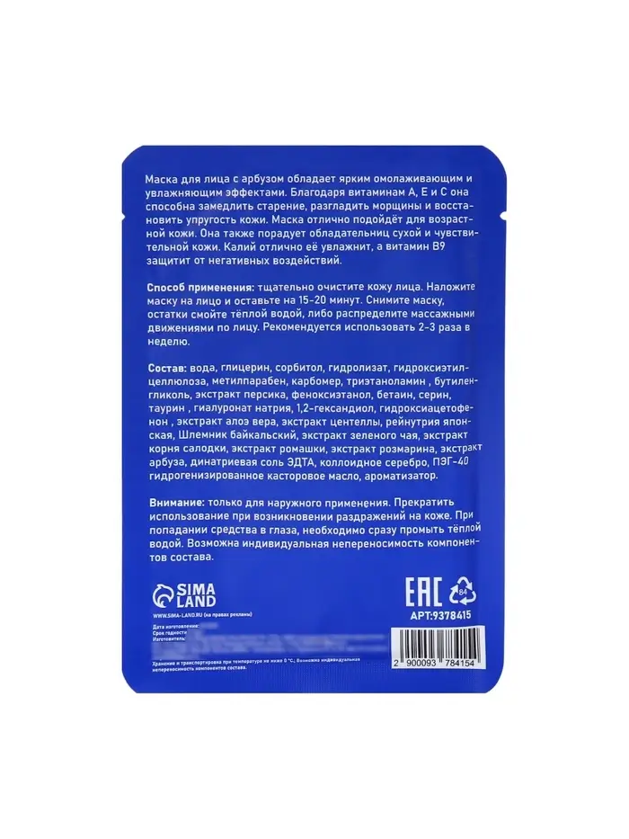 Маска тканевая увлажняющая для лица с экстрактом арбуза