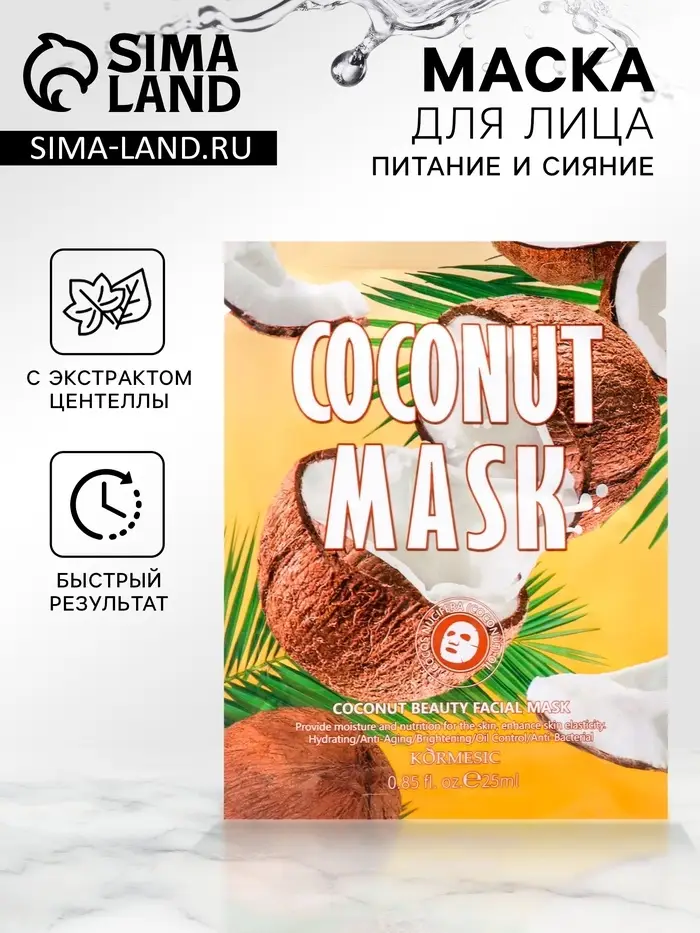 Кокос содержит насыщенные жирные масла, витамины В1, В2, С, Е, железо, магний, калий, кальций, фосфор, цинк. В его состав входят аминокислоты, фруктоза, глюкоза и сахарозы. Маска с экстрактом кокоса увлажняет и питает кожу. Экстракт плодов кокоса повышает упругость кожи, смягчает и тонизирует, а также оказывает антиоксидантное и противовоспалительное действие.