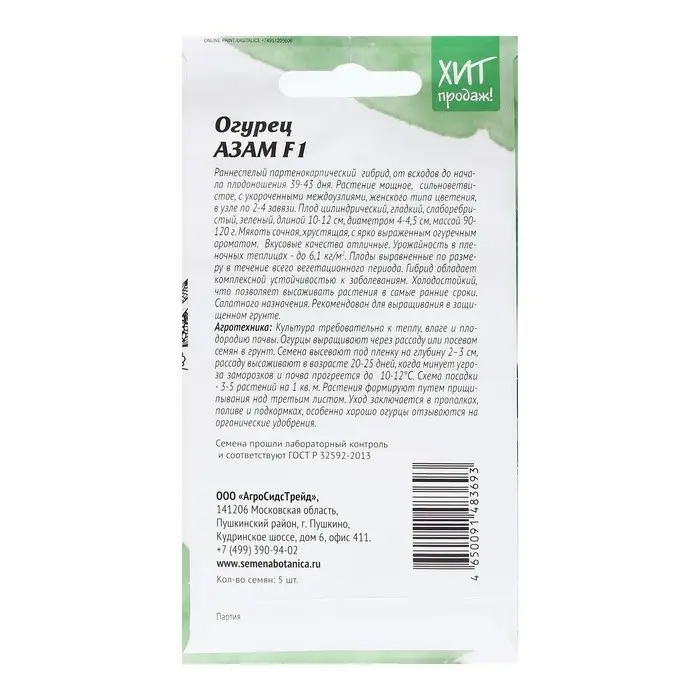 Азам F1 - ранний партенокарпический гибрид огурца (39-43 дня от всходов до начала плодоношения). Рекомендуется для выращивания в весеннем и летне-осеннем оборотах в остекленных и пленочных теплицах. Растения мощные, с укороченными междоузлиями. Ветвление сильное, корневая система мощная. Лист среднего размера, полугоризонтальный, сочно-зеленый. Тип цветения женский, в узле по 2-4 завязи.