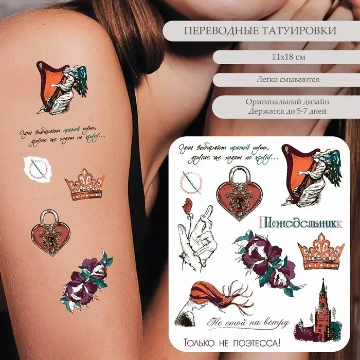 Эти переводные татуировки — больше чем просто украшение. Это способ рассказать свою историю, выразить настроение или дополнить образ яркими деталями. Позвольте себе быть смелой, креативной и неповторимой, превращая каждый день в возможность для самовыражения.