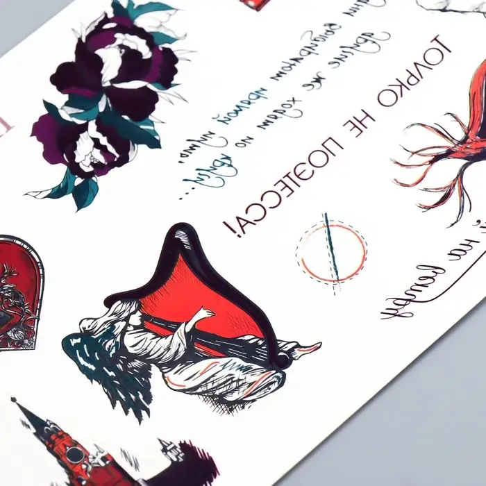 - Простота нанесения: переводные татуировки легко фиксируются на коже, не требуя специальных навыков, и сохраняют чёткость рисунка длительное время.