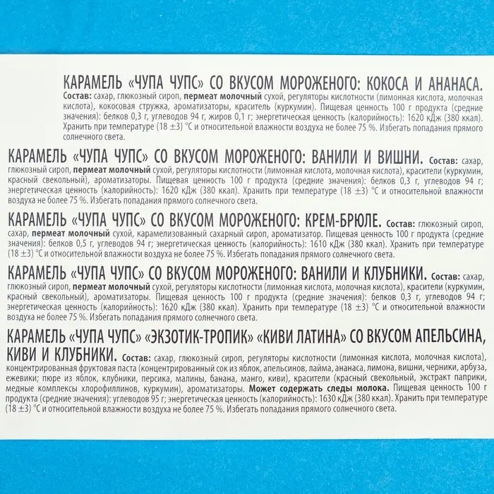 Карамель Chupa Chups Фруктовая + со вкусом колы — это сочетание вкусов ароматной клубники, сочного апельсина, зеленого яблока, спелой ежевики, а также колы. Большой дисплей — это целых 120 штук карамели на палочке Chupa Chups, которые добавят веселья в большой компании! Дисплей можно взять с собой на вечеринку, хранить дома или делиться с друзьями. Попробуйте карамель Chupa Chups Фруктовая + со вкусом колы! Халяльный продукт.