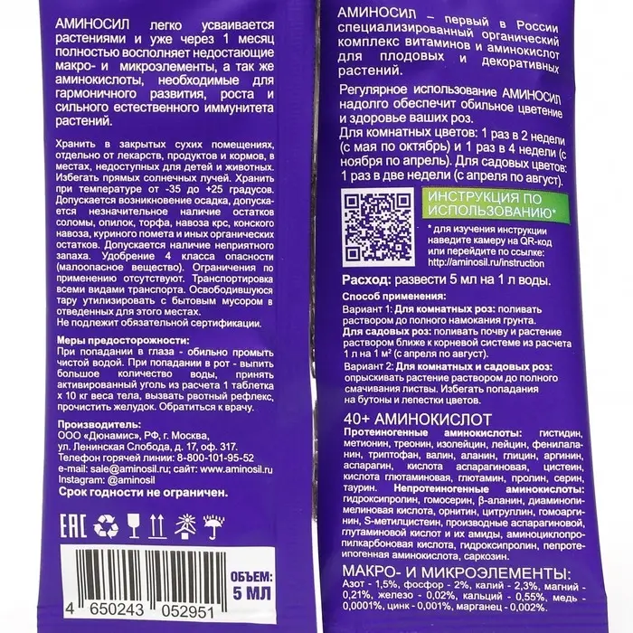 Витамины для роз Аминосил созданы для полноценного сбалансированного питания всех типов роз весной и летом. 100% органический состав. Макро и микроэлементы. 40+ аминокислот.Удобрение для роз содержит все необходимые элементы питания, которые необходимы для здоровья и красоты растений. Подкормка для цветущих обладает уникальной формулой, которая способствует быстрому и здоровому росту цветов и обеспечит пышное продолжительное цветение садовых цветов. Оно содержит все важные макро и микроэлементы, а также натуральные добавки, которые увеличивают количество питательных веществ, необходимых для роста и цветения. Рекомендуется использовать в период активного роста растений и цветения.5 мл витаминного концентрата АМИНОСИЛ для роз разбавить в 1 л воды до образования однородного раствора.Вариант 1:• Для комнатных роз - поливать почву и растение получившимся раствором ближе к основанию до полного намокания грунта;• Для садовых роз - поливать почву и растение получившимся раствором ближе к корневой системе из расчета 1 л на 1 м².Вариант 2:Опрыскивать растение полученным раствором с помощью пульверизатора до полного смачивания листвы. Избегать попадания на бутоны и лепестки цветов.Периодичность:• Для комнатных роз 1 раз в 2 недели (с мая по октябрь) и 1 раз в 4 недели (с ноября по апрель);• Для садовых роз 1 раз в 2 недели (с апреля по август). Наилучший органический состав для роз;Накопительный эффект, который постоянно усиливает иммунитет растения и улучшает зимостойкость;Обеспечивает пышное продолжительное цветение;