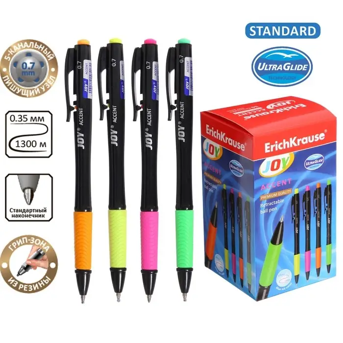 Ручка шариковая автоматическая ErichKrause JOY Accent, Ultra Glide, узел 0,7 мм, резиновый упор, супер-мягкое письмо, цвет чернил синий, МИКС
