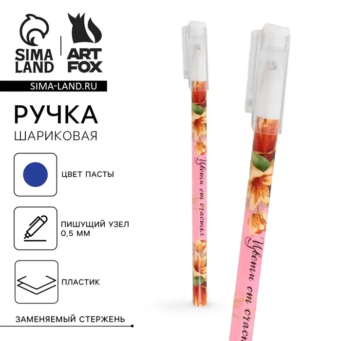 Ручка шариковая синяя паста 0.5 мм с колпачком «Цвети от счастья» пластик
