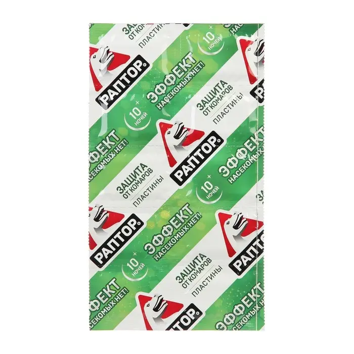 Пластины «Раптор» обеспечивают 100% уничтожение комаров в помещении. Для использования достаточно вставить пластину в гнездо фумигатора. При нагревании средство начинает постепенно испаряться, что обеспечивает равномерность распространения действующего вещества в воздух. Препарат уничтожает как уже находящихся в помещении особей, так и вновь залетающих насекомых. Пластина начинает действовать всего через 10-15 минут после включения прибора.В состав входит высокоэффективное японское действующее вещество. etoc® (эток) – 9 мг/пластину, синергист – 30 мг/пластину, краситель, отдушка, стабилизатор, растворительДля использования достаточно вставить пластину в гнездо фумигатора. При нагревании средство начинает постепенно испаряться, что обеспечивает равномерность распространения действующего вещества в воздух. Препарат уничтожает как уже находящихся в помещении особей, так и вновь залетающих насекомых.