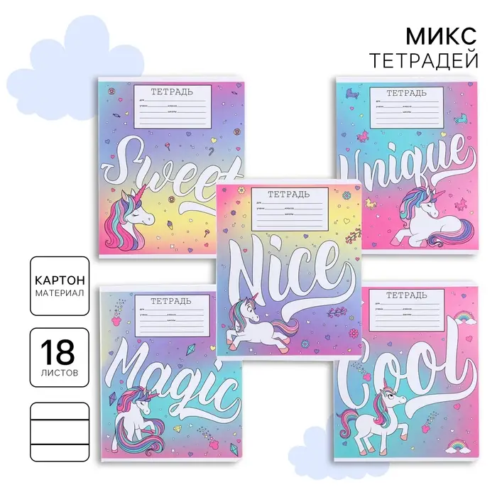 Тетрадь в линейку 18 листов, 5 видов МИКС, обложка мелованный картон, «Минни Маус и единорог»
