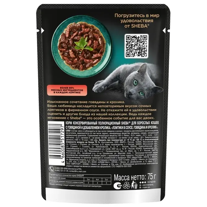 Влажный корм Sheba для кошек, говядина/кролик, пауч, 75 г
