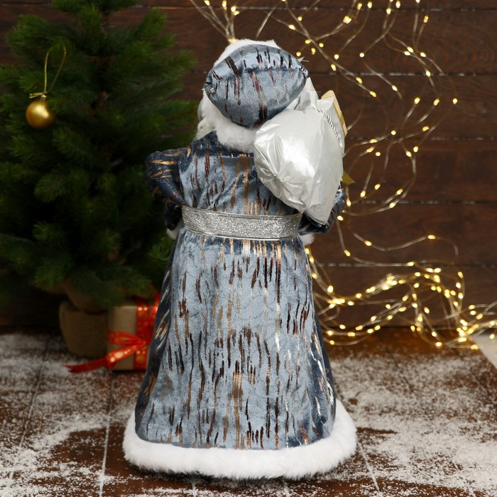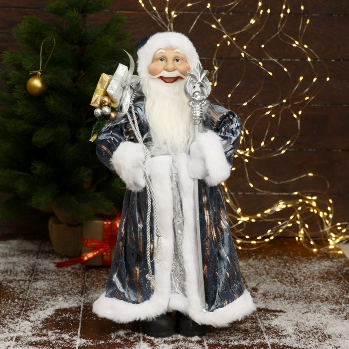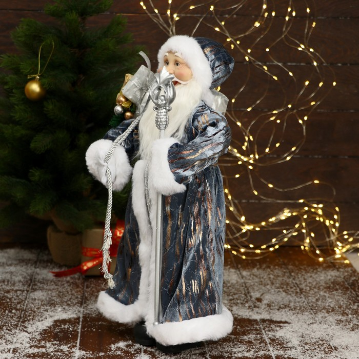 Дед Мороз "В серо-синей шубе, с посохом и подарками" 45х23 см