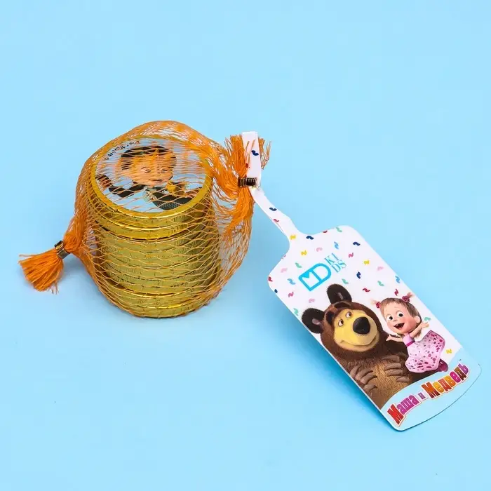 Золотая авоська "Маша и Медведь" (6 г) — это увлекательное и вкусное угощение для детей и взрослых! Упакованные в яркую и привлекательную упаковку, шоколадные монетки с глазурью подарят радость и моменты сладкого наслаждения.