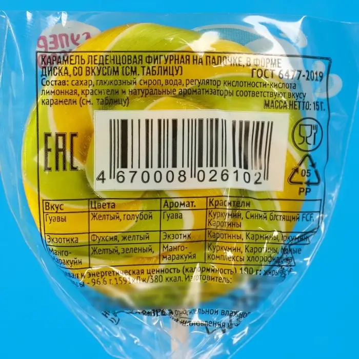 Карамель леденцовая «Диск», кислая, на палочке, 15 г
