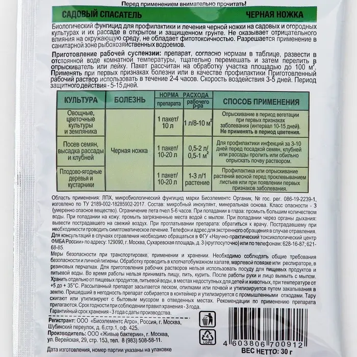Биологический фунгицид для профилактики и лечения черной ножки на садовых и огородных культурах и их рассаде в открытом и защищенном грунте.