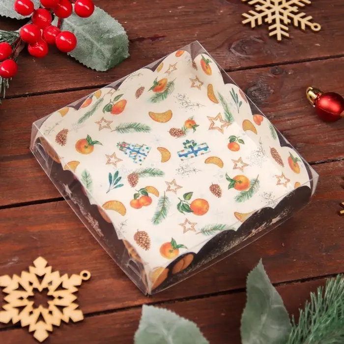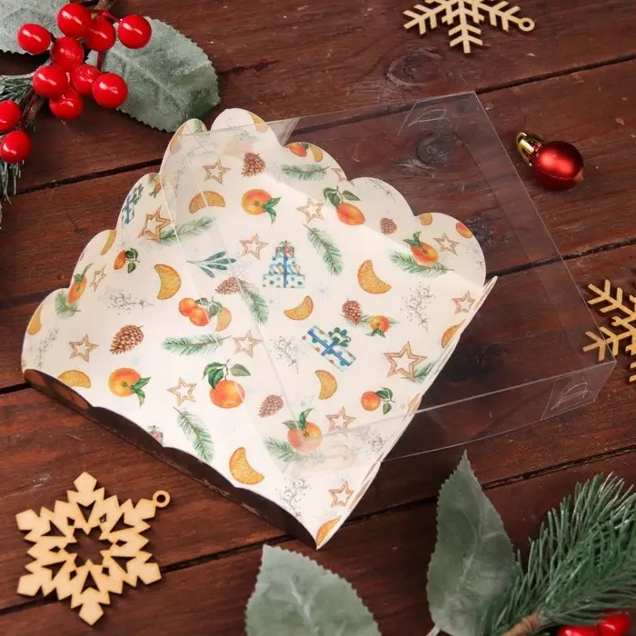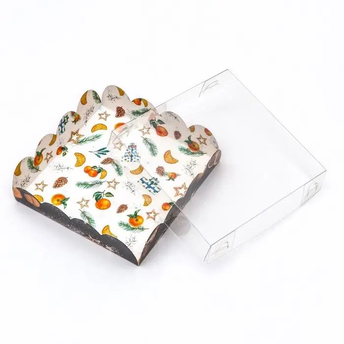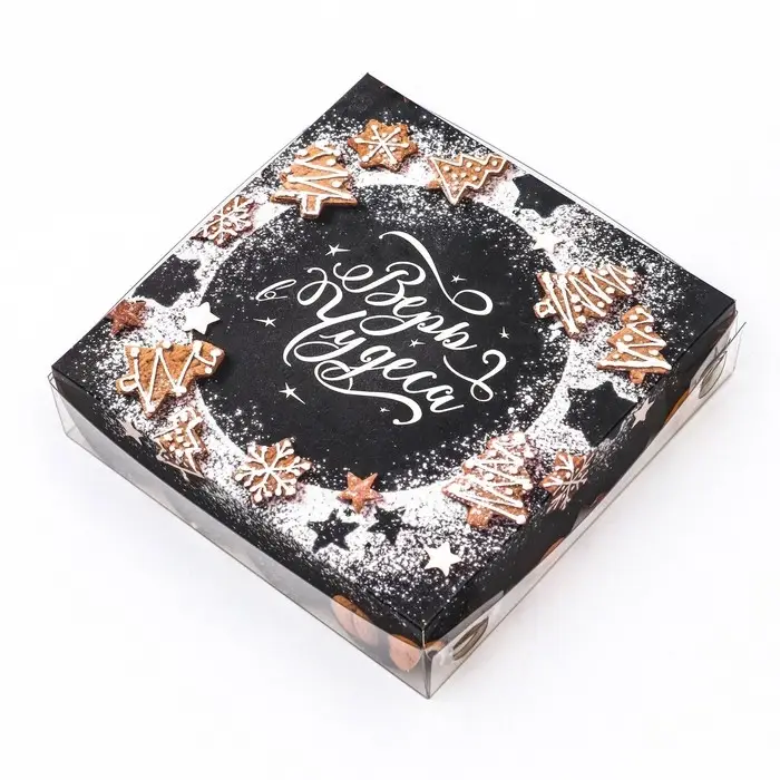 Коробка для печенья с прозрачной крышкой, можно видеть содержимое коробки. Прекрасно подойдет для десертов, можно использовать для праздничного декора.