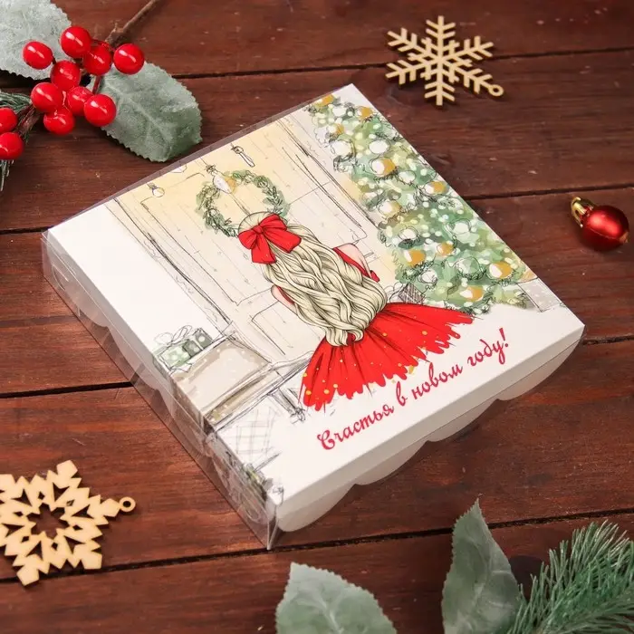Коробка для печенья с прозрачной крышкой, можно видеть содержимое коробки. Прекрасно подойдет для десертов, можно использовать для праздничного декора.