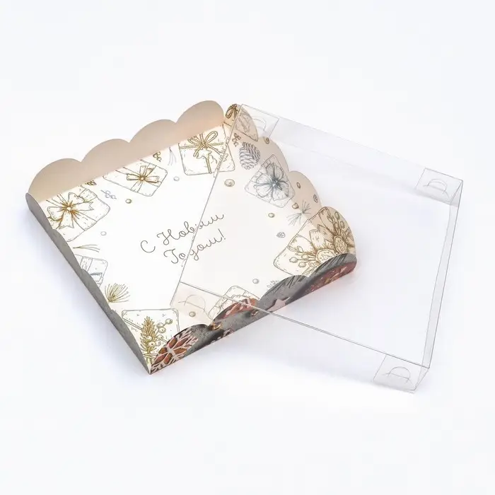 Коробка для печенья с прозрачной крышкой, можно видеть содержимое коробки. Прекрасно подойдет для десертов, можно использовать для праздничного декора.