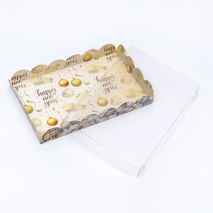 Коробка для печенья с прозрачной крышкой, можно видеть содержимое коробки. Прекрасно подойдет для десертов, можно использовать для праздничного декора.