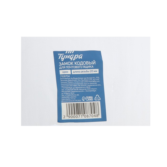 Замок кодовый ТУНДРА, для почтового ящика, цвет хром, длина резьбовой части 20 мм
