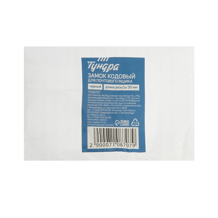 Замок кодовый ТУНДРА, для почтового ящика, цвет черный, длина резьбовой части 30 мм