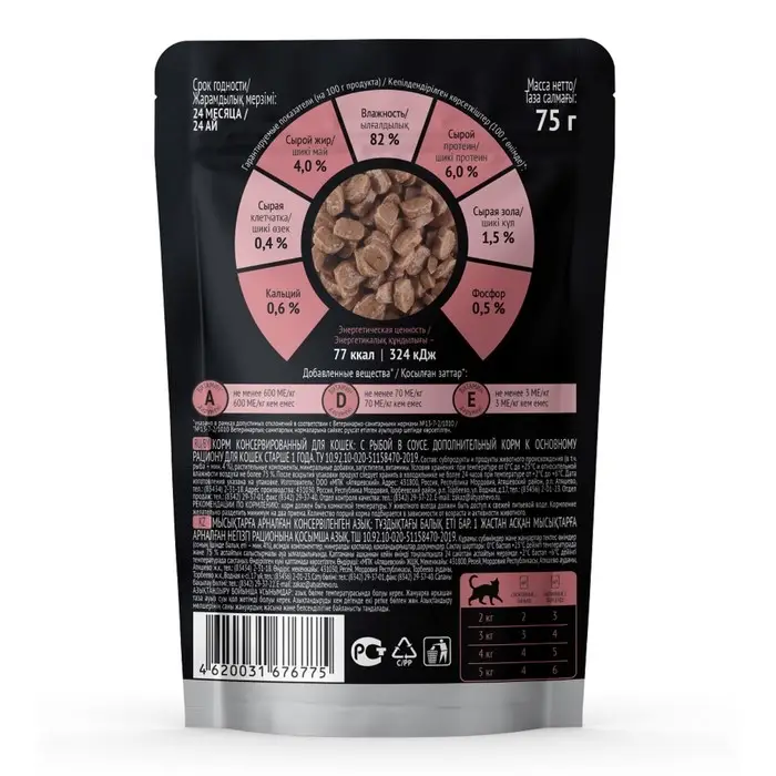 Состав: субпродукты и продукты животного происхождения (в т.ч. рыба – мин. 4 %), растительные компоненты, минеральные добавки, загустители, витамины.