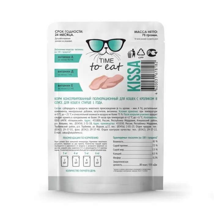 Рекомендации по кормлению: корм должен быть комнатной температуры. Кормление желательно разделить минимум на два приема. Количество порций корма подбирается в зависимости от возраста и активности животного из расчета среднего веса животного 4-5 кг рекомендуется 3-4 пакетика корма. У животного всегда должен быть доступ к свежей питьевой воде.